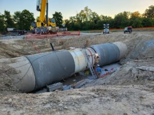 - Work continues at the site today with crews completing all the connections necessary to fully close the transmission main and a concrete foundation being poured underneath the new pipe