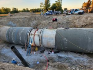On Wednesday, August 31 crews completed the placement of all new segments of pipe at the site of the broken 120-inch transmission main just west of GLWA’s Lake Huron Water Treatment Facility. Today, crews are working to complete all the connections between pipes that are required to fully close the transmission main, as well as pour a concrete foundation underneath the new segments of pipe to provide it with long-term stabilization.